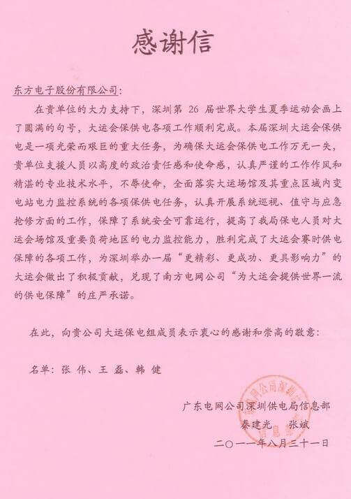 8月23日,世界大学生运动会在深圳圆满落幕,南京新沐科技有限公司作为大运会唯一保电企业见证了世界大学生体育运动的蓬勃发展。南京新沐科技有限公司技术中心系统部与工程部坚守“忠于职守,全力以赴,誓保大运电网安全”的信念,联手实现了大运保供电期间系统零故障、零缺陷的目标。